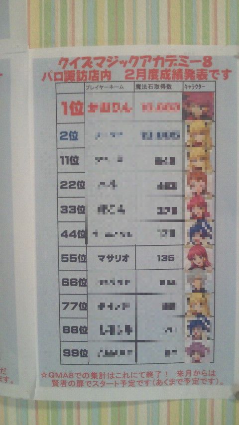 QMA8稼働後、パロ諏訪では「月間魔法石獲得ランキング」というものをやっていまして、